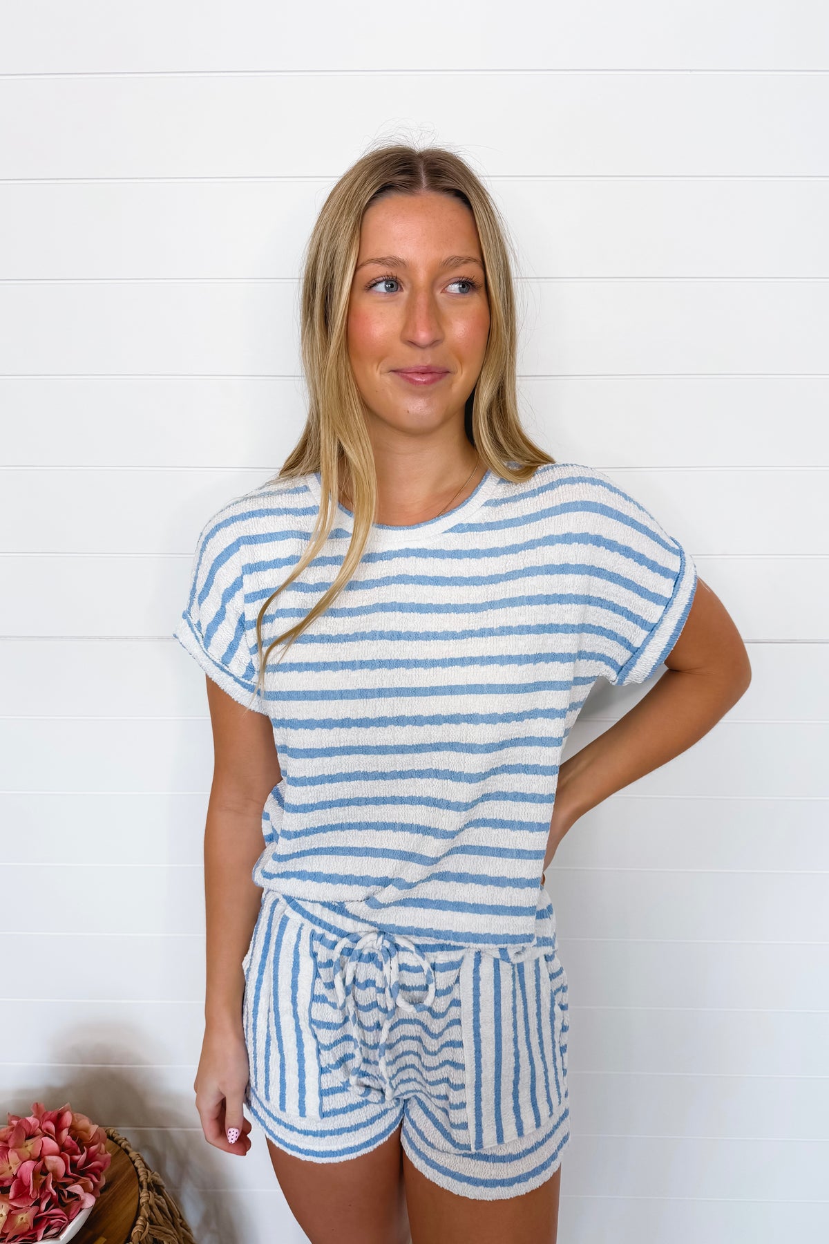 Oceanside Striped Ribbed Shorts - Light Blue/White