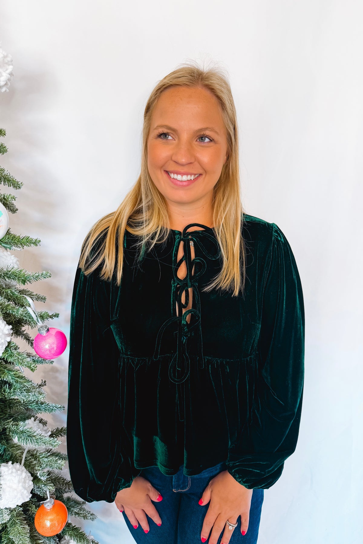 A Bit of Shimmer Velvet Tie Peplum Blouse - Hunter Green