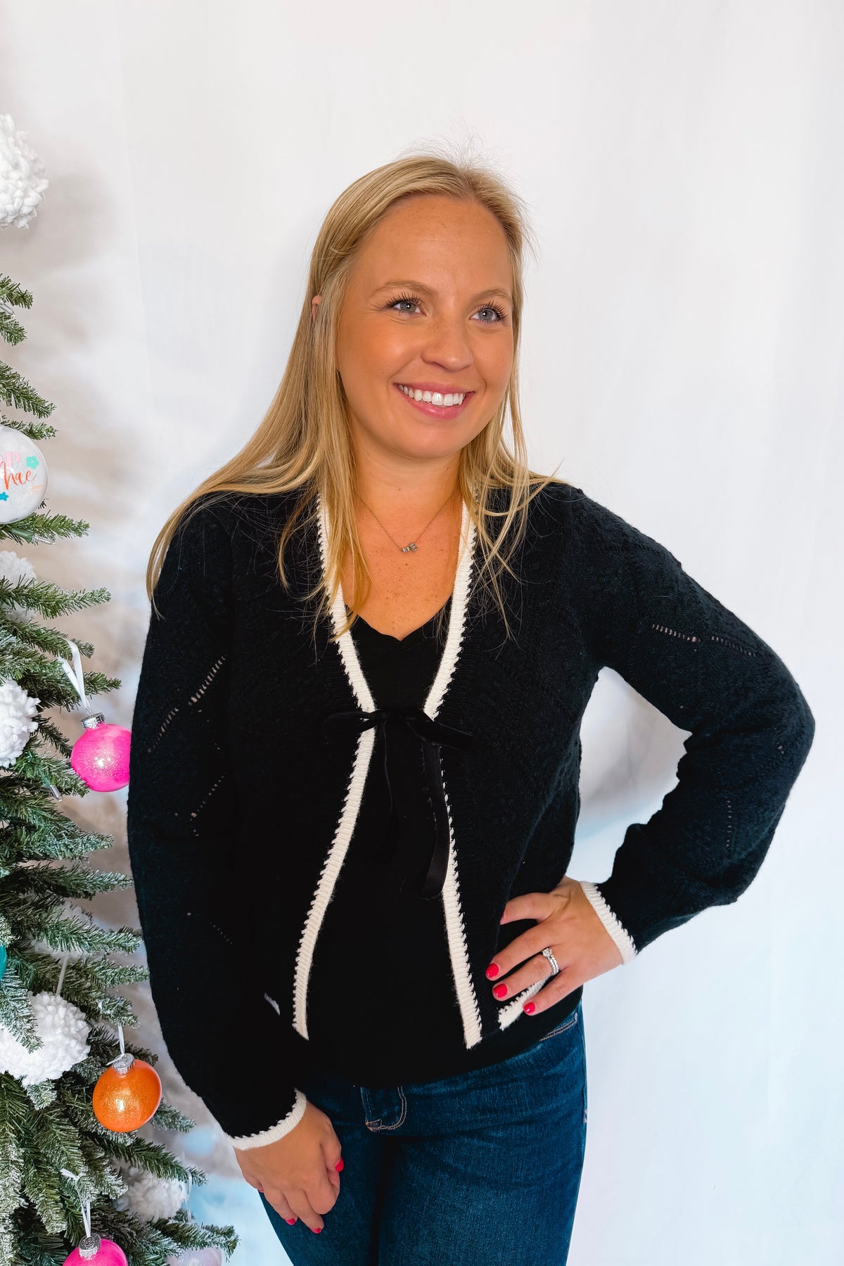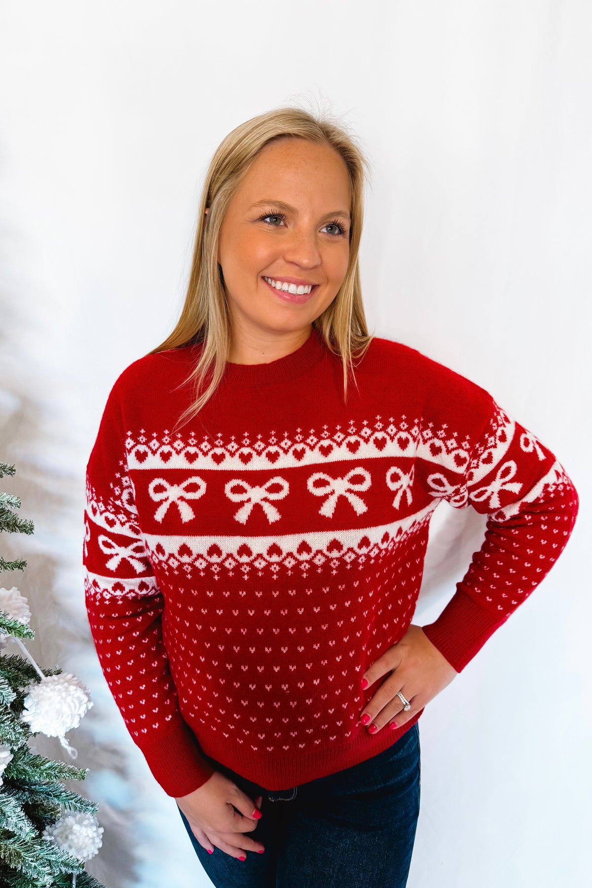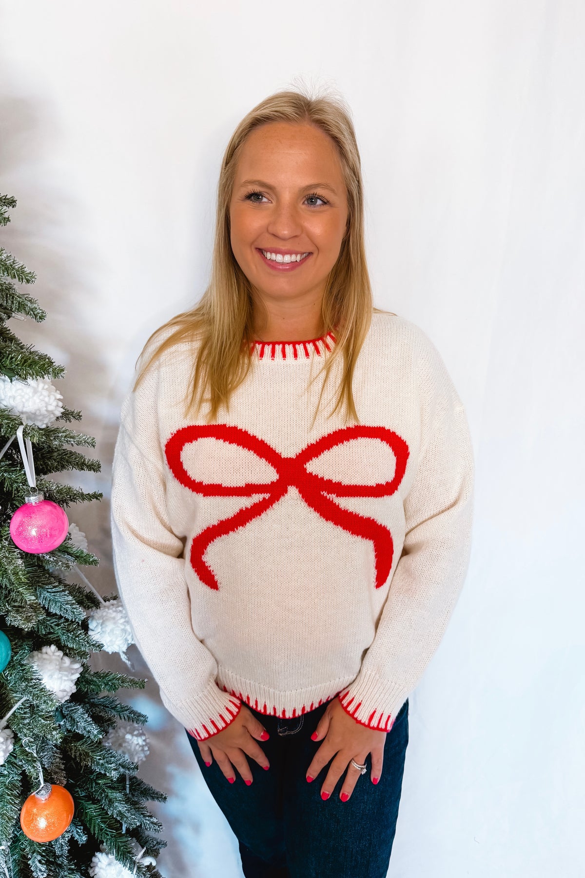 All Wrapped Up Bow Crew Knit Sweater - Ivory/Red