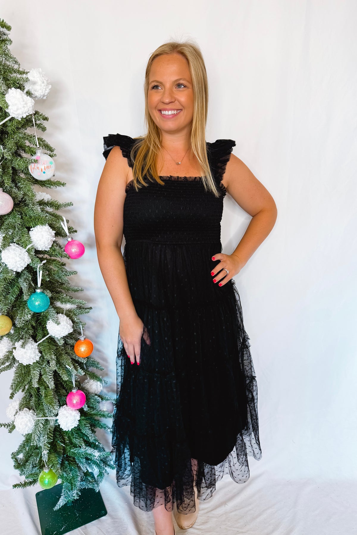 Monica Ruffle Strap Tulle Midi Dress - Black
