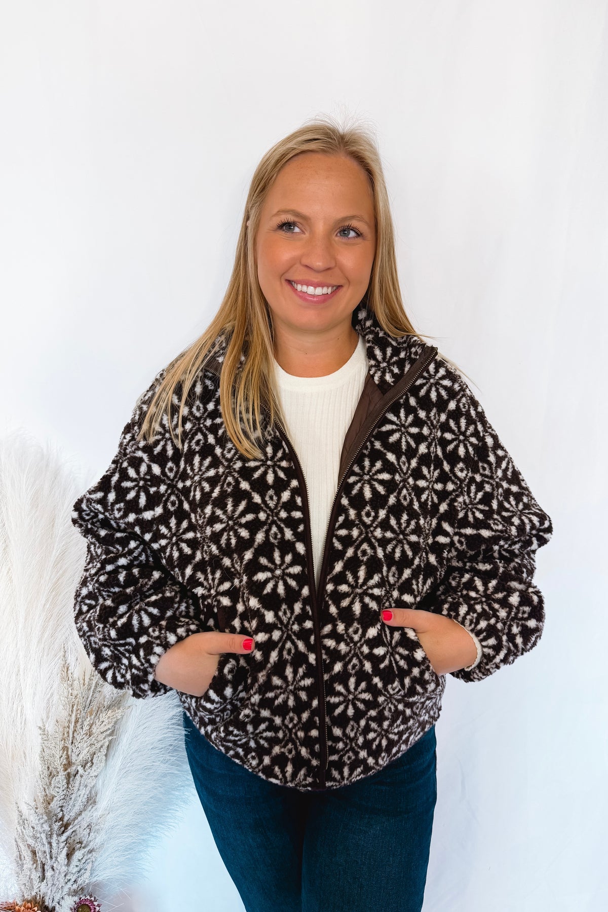 Mountain Views Snowflake Zip-Up Sherpa Jacket - Brown