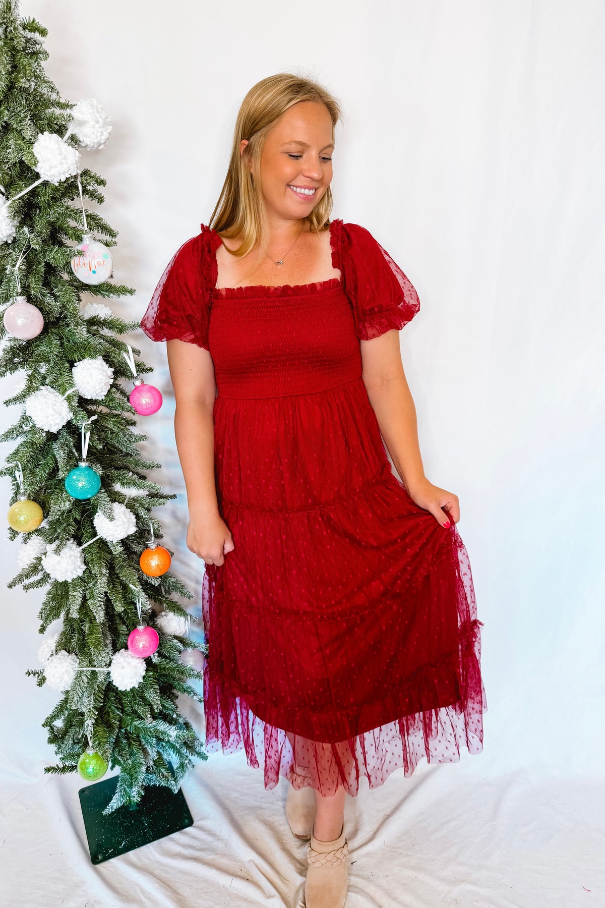 Phoebe Puff Sleeve Tulle Midi Dress - Red