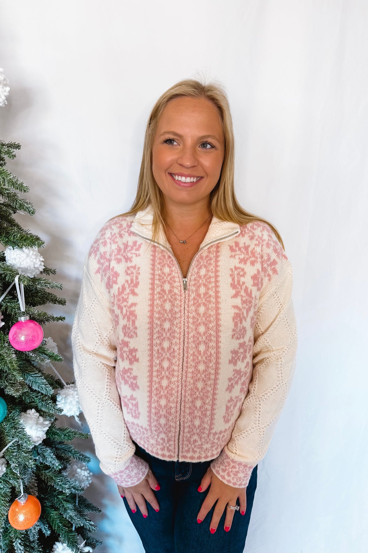 The Cozy Edit Full Zip Sweater - Ivory/Pink